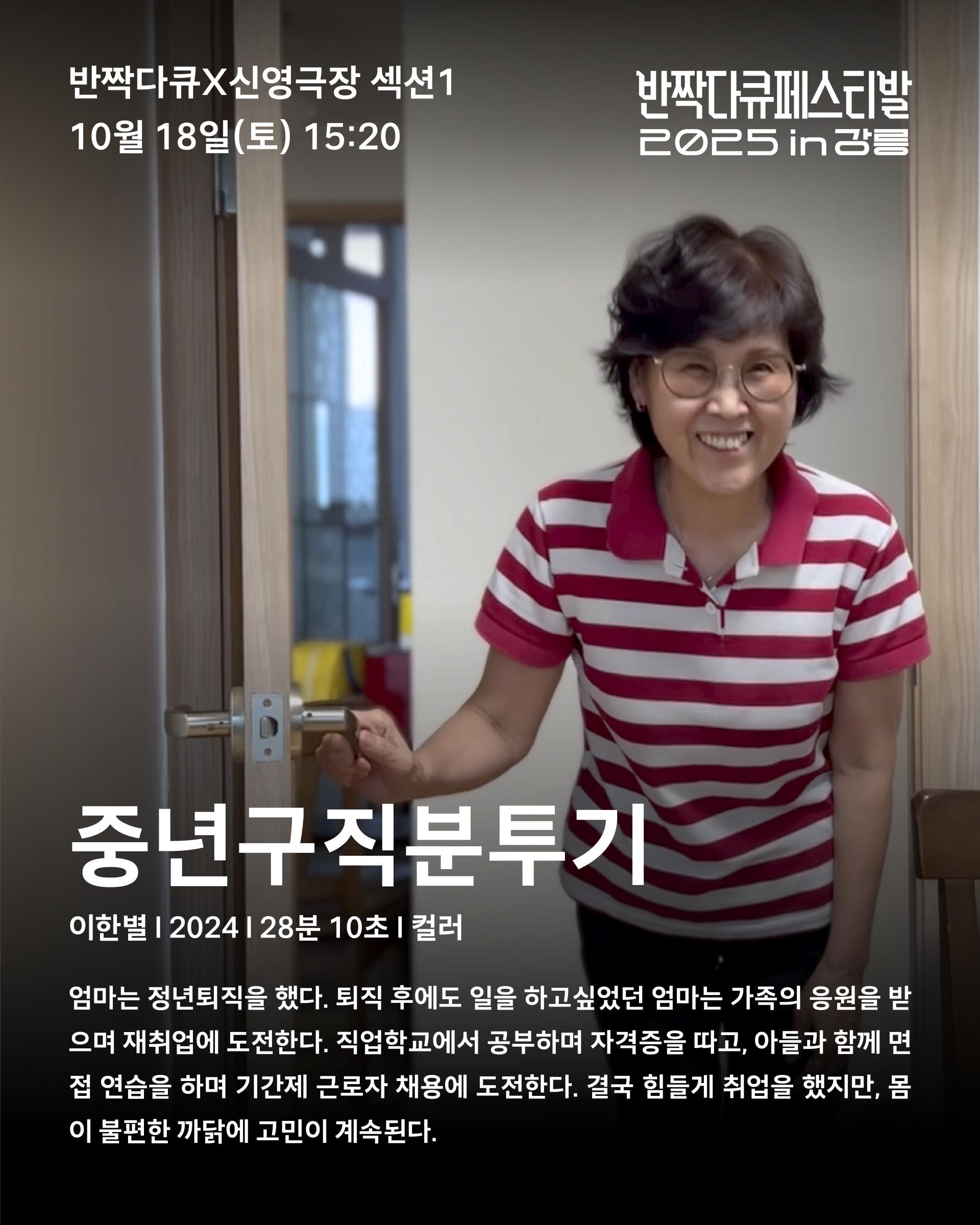 | 10/18(토) 15:20 | 반짝다큐X신영극장 섹션1 (71분) <뼈와 살을 가진 유령> l <우리가 만든 궤적> l <중년 구직 분투기>
