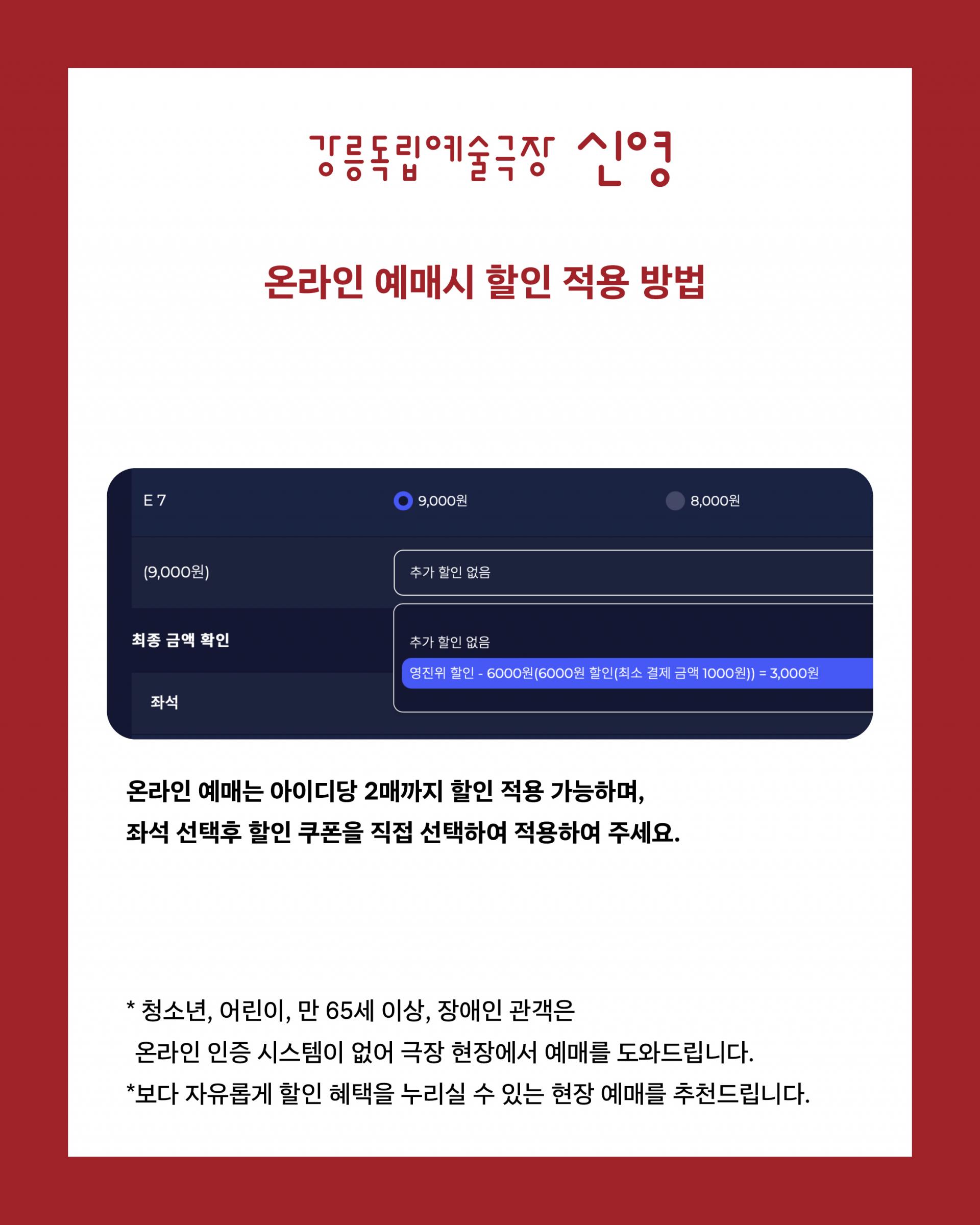 · 청소년, 어린이, 만 65세 이상, 장애인 관객은 온라인 인증 시스템이 없어 현장에서 할인 예매를 도와드립니다.