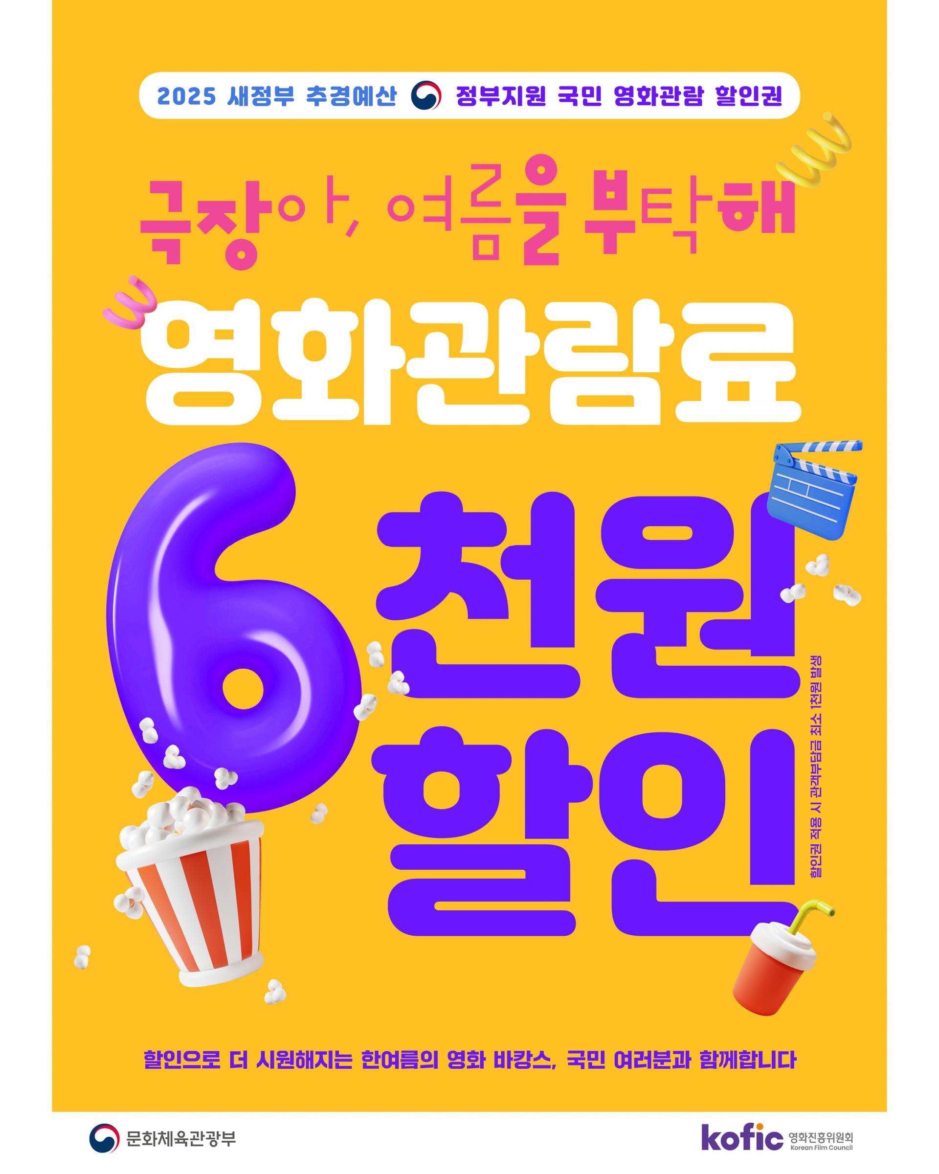정부가 추진하는 영화관람 활성화 관객지원 사업으로, 전국 영화관 관객에게 편당 6천 원의 관람료 할인을 제공합니다.