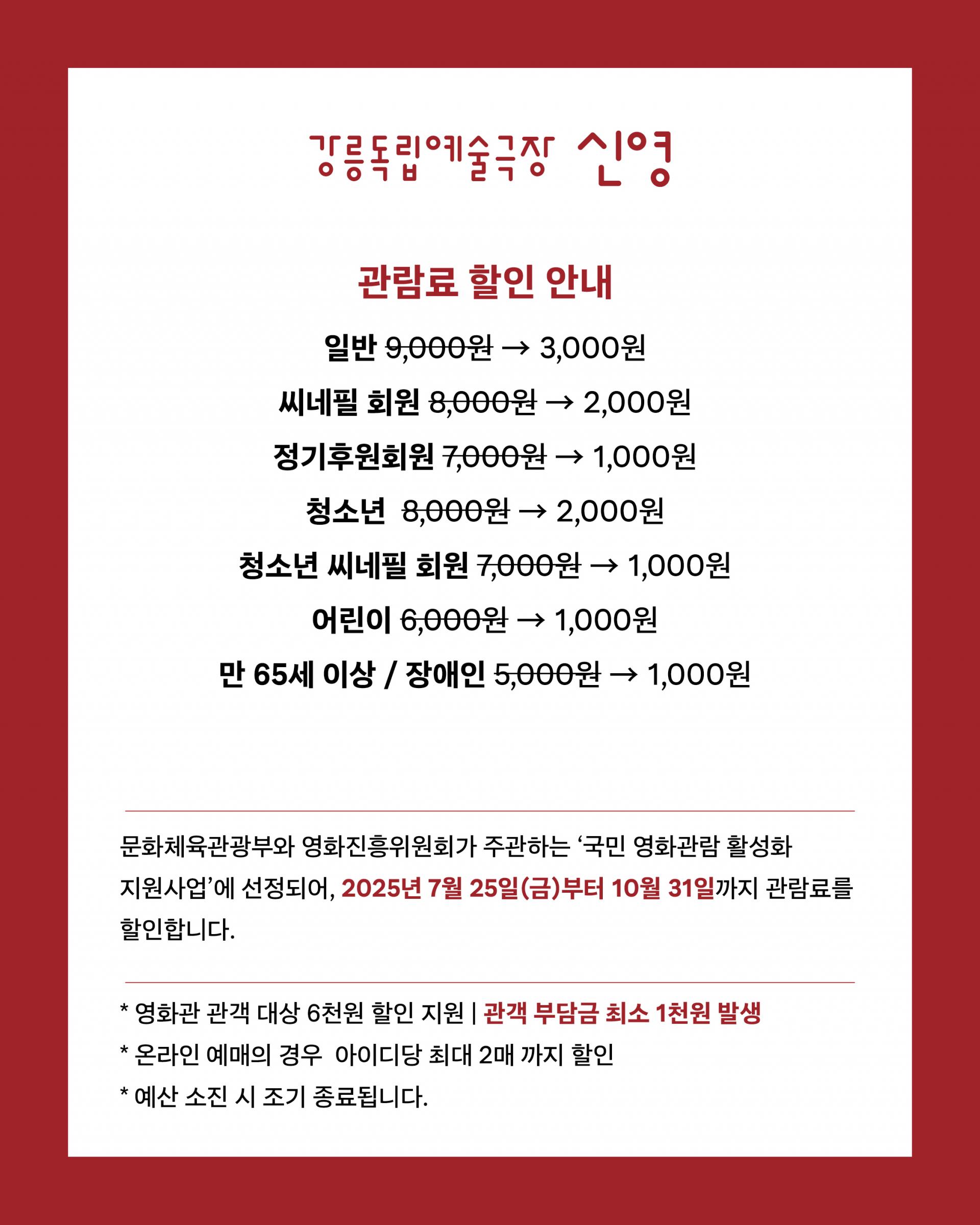 강릉독립예술극장 신영은 문화체육관광부와 영화진흥위원회가 주관하는 ‘국민 영화관람 활성화 지원사업’에 선정되어 관객 여러분께 관람료 6천 원 할인 혜택을 제공합니다.