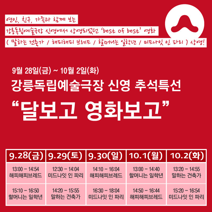 올 추석! 강릉독립예술극장 신영 추석특선영화와 함께 즐거운 한가위 보내세요.
