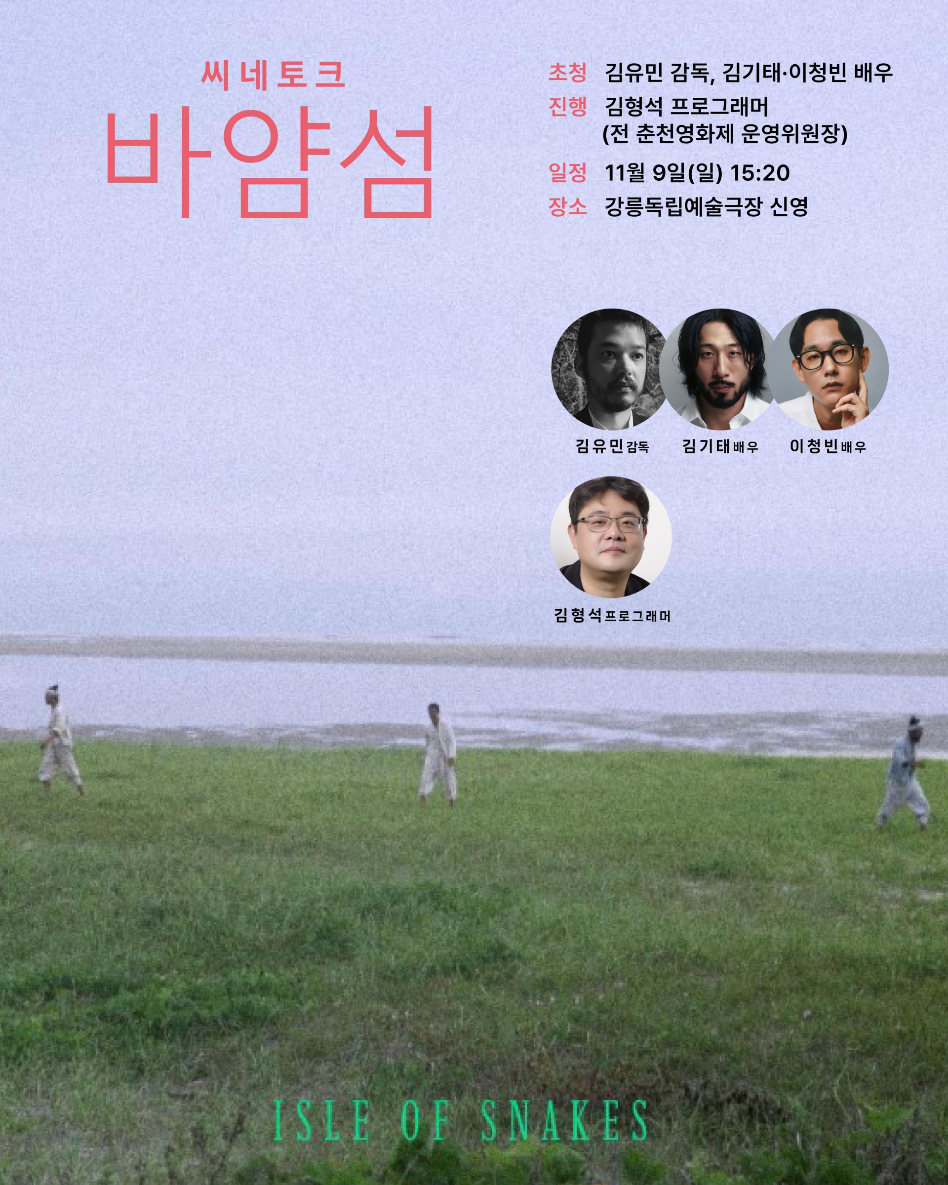 영화 상영 후에는, <바얌섬>을 연출한 김유민 감독, 출연 배우 김기태, 이청빈과 함께, 김형석 전 춘천영화제 운영위원장의 진행으로 작품에 관한 깊이 있는 이야기를 나눕니다.